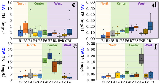 Spatial distribution of TN (a) and TP (b) concentration (a: PN = TN − (NO3−-N + NH4+-N), b: PP = TP − TDP), boxplots of TN (c,e) and TP (d,f) concentration in surface water and shallow groundwater.