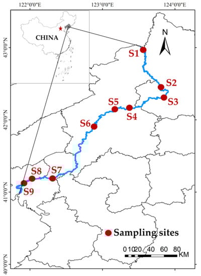 Samples of nine surface sediments (<10 cm) were collected in the main stream of the Liaohe River Protected Area in May 2014 (Figure 1). Nine sampling sites are the intersection point of tributary and main stream in the Liaohe River. Sediment samples were collected by a stainless-steel grab and then dried by a freeze dryer in our laboratory. After drying, the sediments were homogenized with a grinder and passed through a 200 mesh sieve prior to extraction.