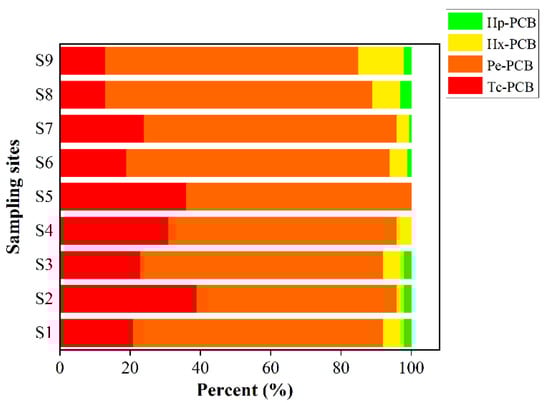 Among all PCBs congeners, tri-, tetra- and penta-CBs were classified as light PCBs, while hexa- and hepta-CBs were classified as heavy PCBs [31]. The distribution trend of dl-PCBs concentrations in the Liaohe River Protected Area is ranked as Pe-PCB > Tc-PCB > Hx-PCB > Hp-PCB, which was similar to the PCB distribution in sediments of Fenhe reservoir [32] and Jiaojiang Estuary [33] from China. The concentration of Pe-PCB accounting for more than 55%, even reaching 76% at S8 (Figure 2). It is worth noticing that Pe-PCB, Tc-PCB, and Hx-PCB are the main PCBs in all sampling sites, which is mainly due to that more than 95% of PCBs discharged to the estuarine environment in China consist of tri-CBs to Hx-PCBs [34]. Obviously, the concentration of heavy PCBs (Hx-PCB and Hp-PCB) is lower than that of light PCBs (Tc-PCB and Pe-PCB). This might be due to the degradation of heavy PCBs into light PCBs through long-distance transportation [30], and because light PCBs are easier to transport [32].