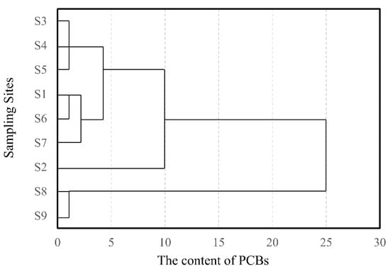 The first group is S2 with a higher level of PCB77, PCB118, and PCB123. The composition of PCBs at S2 is similar to Aroclor1242 and mainly exists in electronic products, indicating those PCBs (PCB77, PCB118, and PCB123) presumably derive from electronic wastes at S2. The second group includes S8 and S9 where the level of PCB156, PCB189 is higher, the composition is similar to Aroclor1254 [37]. The pollution likely derives from commercial products such as Aroclor1254 of oil paint. Other sampling sites comprise the third group with similar compositions of S2, but the concentration of PCBs is further lower than that of S2, which presumably affected by S2. The results indicate a lower level but widespread pollution of PCBs in the third group.