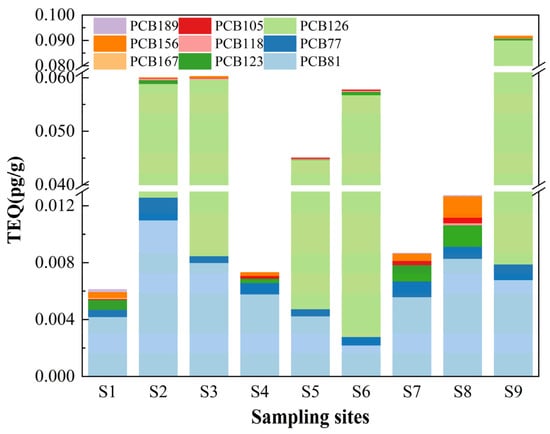 According to the environmental quality standards proposed by Long [38], effect range low (ERL) and effect range mediate (ERM) of PCBs were 22.7 ng/g and 180 ng/g, respectively. The concentration of PCBs ranges from 79.2 to 146.2 pg/g in the sediments from the Liaohe River Protected Area, which is lower than ERL and ERM. Thus, PCBs are unlikely to harm aquatic organisms, because the ecological risk probability of PCBs is less than 10%. The TEQ of PCBs concentration range from 5.8 × 10−3 to 9 × 10−2 pg/g with the average concentration of 3.8 × 10−2 pg/g in the Liaohe River Protected Area. The concentration of PCBs is much lower than the Canadian sediments quality standards (4 pg/g) [39], indicating little ecological risk in the Liaohe River Protected Area. PCB126 is the main contributor to TEQ at S2, S3, S5, S6, and S9 (Figure 5). The difference is mainly caused by the various TEF of diverse PCBs, and PCB126 has a greater carcinogenic risk compared with other PCBs. While PCB126 is not detected at S1, S4, S7, and S8. PCB81 mainly contributes to TEQ, but the much lower TEF of PCB81 than PCB126 led to lower total TEQ at S1, S4, S7, and S8. However, the possible ecological hazards cannot be ignored due to the bio-accumulative effect of PCBs.