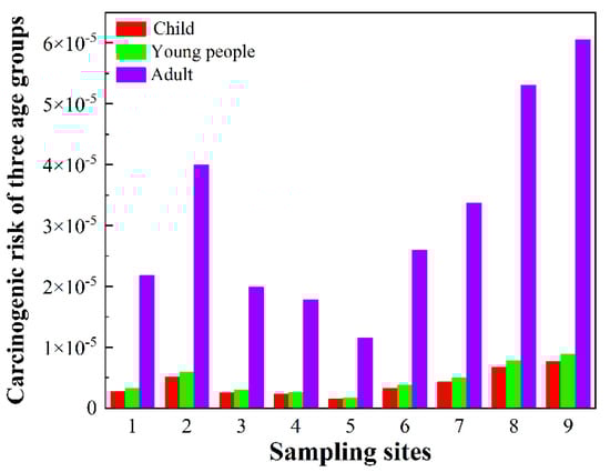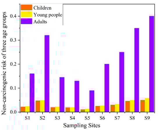 This study carried out the non-carcinogenic risk assessment of nine species of PCBs. The results showed a low carcinogenic risk from ingesting fish grown in the studied areas. The non-carcinogenic risk values for children, young people and adults were respectively 2.8 × 10−2 (1.1 × 10−2 to 5.0 × 10−2), 3.3 × 10−2 (1.3 × 10−2 to 5.8 × 10−2), and 0.23 (9 × 10−2 to 0.40), non-carcinogenic risk is less than 1 (Figure 6), indicating little risk of non-carcinogenic. The non-carcinogenic risk of adults in the three groups was significantly great, which is 8.2 times and 7 times higher than that of children and young people, respectively. The selection of non-carcinogenic parameters mainly contributes to the difference in the evaluation results. The highest exposure dose and non-carcinogenic risk present in adults on account of the longest exposure dose and highest direct intake rate of the fish. The non-carcinogenic risk of children is lower than that of young people but with higher exposure dose (ED) on account of the lower fish intake rate (IR) and body weight (BW). Contaminants dose intake (CDI) calculation shows lower BW and ED of children than that of young people, indicating the lower non-carcinogenic risk of children.