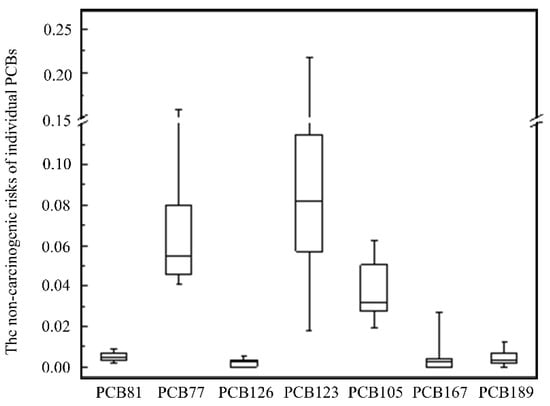 The same chronic reference dose (RD) values of different monomer PCBs indicates that the non-carcinogenic risk of each monomer was related to the concentration and the exposure parameters of diverse people (Figure 7). In order to provide guidance for controlling pollutant emissions and protecting human health, we selected major contributors to non-carcinogenic risk by comparing PCB isomers. The isomers that put adults at the highest risk of developing non-carcinogenic risk were selected for the study. The non-carcinogenic risk of each PCBs isomer is lower than 1, indicating little non-carcinogenic risk for single isomer. PCB123 and PCB77 are the main contributors to the non-carcinogenic risk for their highest concentration.