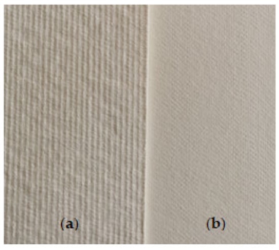 Cellulose was supplied in sheet form, with size of 65 × 80 cm for softwood (long fibers, Figure 3a) and 59 × 83 cm for hardwood (short fibers, Figure 3b), and a number of steps were required in order to obtain laboratory sheets of filter paper with mass added algae.