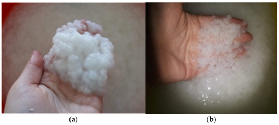 The value of the beating degree of cellulose used for this research is different for each type: for bleached softwood kraft pulp (BSK), the value of the beating degree was 19o SR (Figure 4a), and for bleached hardwood kraft pulp (BHK), the value of the beating degree was 17° SR (Figure 4b).