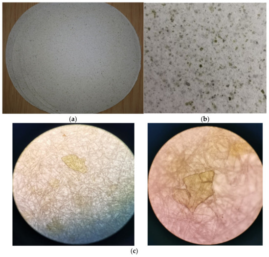 (a) Laboratory sheet of filter paper with the addition of 8% algae of the species Ulva rigida, 20 cm Ø; (b) 8% filter paper surface, zoomed image. (c) Embedding of seaweed in the paper structure and sequestration of seaweed particles by cellulose fibers. Images obtained by using the ZEISS Axiostar Plus Binocular Microscope, 50× magnitude.