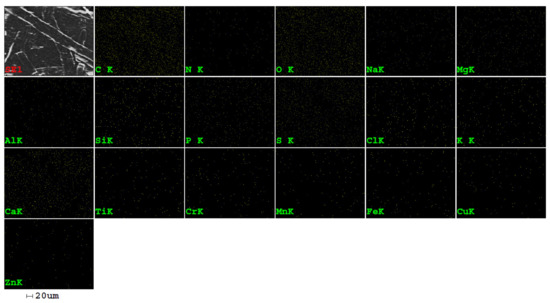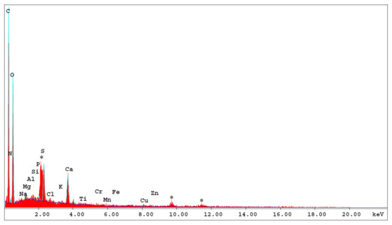 In order to characterize the materials (algae and filter paper) used in these experiments, the scanning electron microscopy (SEM) method was used to complete the information about the morphology of the samples, coupled with the energy-dispersive X-ray analysis (EDX) for the acquisition and mapping of the elemental concentration of tested samples. SEM images (500 µm scale bar) were taken by using a FEI QUANTA 200 scanning electron microscope at Dunarea de Jos University of Galati (UDJG), Romania. For all the investigations, a beam accelerating voltage of 20 kV and a secondary electron (SE) signal were used in order to excite as many elements as possible. All synthesized samples were mounted on aluminum stub through the conductive carbon adhesive tape and thereafter sputtered with a thin gold layer, using an SPI Sputter Coater Module equipment (SPI Supplies, West Chester, PA 19380-4512, USA). Determination of the elemental distribution was carried out by EDX microanalysis technique developed by the authors at INPOLDE research center of UDJG [52,53], using a solid-state Si (Li) detector coupled to SEM. The ZAF matrix correction algorithm (Z = atomic number, A = absorption and F = fluorescence) was used to convert the apparent concentrations (raw spectral line intensity) into (semi-quantitative) concentrations corrected for inter-element effects [52].