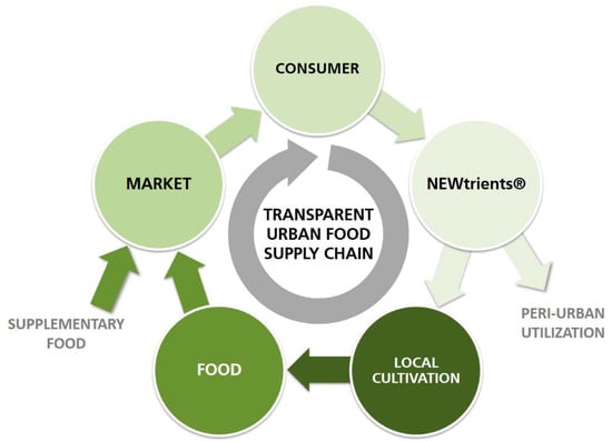 The overarching goal of the SUSKULT vision is to introduce urban agricultural production as a component of the circular urban economy of the future (see Figure 2) as an innovative sector of a bio-based economy in Germany. We follow the consensus view of basic notions of the circular economy as an economic system that represents a change of paradigm in the way that human society is interrelated with nature and aims to prevent the depletion of resources, close energy and materials loops, and facilitate sustainable development through its implementation at the micro (enterprises and consumers), meso (economic agents integrated in symbiosis) and macro (city, regions and governments) levels []. The circular urban economy approach according to the SUSKULT vision is specifically developing a hydroponic-based sustainable and local food production system.