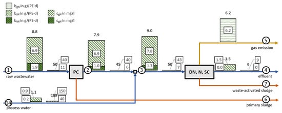 Load (b) and concentration (c) balance of nitrogen based on inhabitant specific values according to Table 1 for a model WWTP with chemical phosphorous removal and anaerobic sludge stabilization—Part 1 wastewater treatment, with: bgN gaseous nitrogen load; bsN dissolved nitrogen load; bxN solid nitrogen load; csN dissolved nitrogen concentration; cxN solid nitrogen concentration; PC primary clarifier; DN denitrification; N nitrogen removal; and SC secondary clarifier.