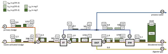 Load (b) and concentration (c) balance of nitrogen based on inhabitant specific values according to Table 1 for a model WWTP with chemical phosphorous removal and anaerobic sludge stabilization—Part 2 sludge treatment, with: bgN gaseous nitrogen load; bsN dissolved nitrogen load; bxN solid nitrogen load; csN dissolved nitrogen concentration; cxN solid nitrogen concentration; ST sludge thickener; DGT digester; DW de-watering.