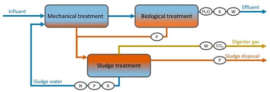 In the majority of countries of the OECD (Organization for Economic Co-operation and Development) more than 80% of the population is connected to municipal WWTPs, in some countries the connection rate is even close to 100 % []. For example in Germany 96.5 % of the population is connected to central WWTPs []. Thus, resources discharged in the sewer system are accumulated at the site of WWTPs. The objective of conventional wastewater treatment is to reduce contaminants in wastewater to a level that can be released into the environment without negative effects for the receiving waters. State of the art is degradation or precipitation of these substances and depollution of the wastewater during the treatment process, because otherwise discharges of wastewater containing relevant amounts of organic components and nutrients result in oxygen depletion and eutrophication of water bodies. Therefore, WWTPs have to comply binding limits for nitrogen, phosphorous and organic discharges in several countries such as member states of the EU [] (for example, Germany []) USA [,] or China []). Besides setting emission standards, e.g., in Germany depending on the size of the WWTP [], the state of the receiving water can be decisive for setting surveillance values for the effluent, e.g., in China intended use and type of water body []). Existing treatment technology is constructed to keep the limits. Other parameters are mostly only interesting, if they disturb operation or affect costs (for example energy consumption, demand of chemicals or sewage sludge disposal).