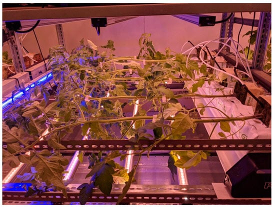 Tomatoes have not been successfully cultivated in IVFs until now, due to predominant cultivation systems. Therefore, production did not seem economically feasible. The approach in SUSKULT thus faces unresolved technical, plant-physiological and economically challenges. One aspect concerns a possible exceeding of the limit concentration of chloride in the targeted fertilizer composition (cf. Section 3.1). In an established growing system, tomatoes are grown in inert substrate such as rockwool. An adaptation and advancement of the established growing system into IVFs, therefore, needs to significantly increase the area use efficiency respectively space utilization efficiency. A horizontal cultivation management on several levels of an IVF seems to be a promising solution to overcome the economical challenge (see Figure 6). The plants are positioned horizontally on wire constructs and exposed from three sides (top, bottom and front) with different light intensities. Through a specific light control, gravitropism is superimposed by long-term impulses with 450 nm of blue light.