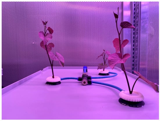 The focus on developing a new cultivation system for sweet potato within SUSKULT is based on previous results by the Tuskegee university in collaboration with NASA as well as Japanese scientists [,] worked on hydroponic growing systems for sweet potatoes, and showed promising findings by the use of nutrition film-techniques (NFT). Implementation of these findings to a successful production in IVFs, however, requires further developments and optimizations, e.g., of the storage root formation. In our own research, however, it was possible to show that aeroponic culture methods (see Figure 8), compared to NFT technology, and are better suited for the cultivation of sweet potatoes.