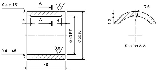 The bearing bushings have the role of supporting the shaft or other parts that make rotational movements (pinions, cams, etc.). The inner surfaces of bushings come into contact with the journals of the rotating part. The inner and outer coaxial revolution surfaces are generally characterized by high accuracy and low roughness. Usually, the outer surface used to fix the bearing bushing to the housing accurately corresponds to tolerance classes 7–8 and average surface roughness of Ra = 1.6 µm. On the other hand, the inner revolution surfaces must be made in tolerance classes 6–8 and have an average surface roughness of Ra = 0.8 µm.