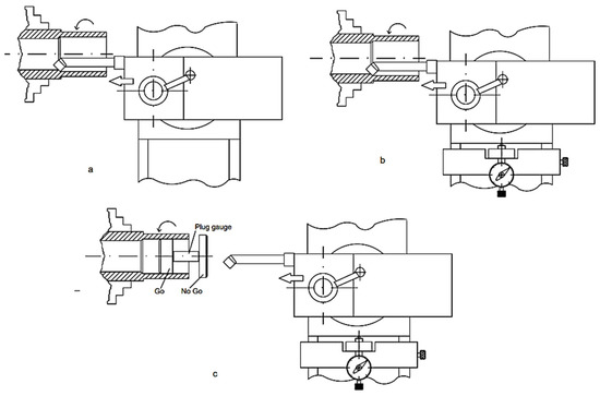 Alternatives for finishing turning considered: (a) initial alternative A1 (turning under normal conditions); (b) alternative A2 (correcting the position of the tool using a dial comparator device); (c) alternative A3 (correcting the position of the tool using the dial gauge device and checking the machined surface using a go plug gauge (adapted from [10]).