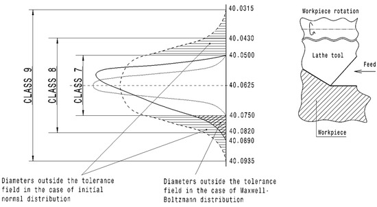 As shown in Figure 3, outside the prescribed tolerance range (40.050 mm–40.075 mm) will remain the parts whose diameters of the inner surfaces are in the range 40.075 mm–40.089 mm. Accepting a value α = 2 and using a method of graphically approximating the surface size between the curve corresponding to the Maxwell–Boltzmann distribution and the abscissa axis, it was found that the range 40.075–40.089 will correspond to a percentage of 7.9% of the total area between the curve and the abscissa axis in the range 40.050–40.089, which means that 7.9% of the parts will have dimensions outside the prescribed tolerance range (the hatched area in Figure 3).