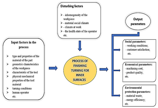 The systemic analysis is a way of approaching a problem in manufacturing, in which the investigated process or equipment is treated as a system, with input factors and output parameters. The use of systemic analysis allows a complete identification of the factors likely to affect the values of the output parameters, and possibly how the input factors influence the values of the output parameters. The disturbing factors can also be highlighted using the systemic analysis. Disturbing factors are those whose values cannot be adjusted by users but can influence the output parameters’ values. Research concerns have sought to address sustainability issues as a system, using principles from the systemic analysis [12,13,14,15,16]. In the case of the problem addressed in this paper, i.e., the sustainable manufacture of technology for finishing the inner surfaces of bearing bushes, the use of systemic analysis will have to facilitate the identification of those factors capable of affecting the accuracy of the inner surface of the bearing bushing by applying a finishing turning.