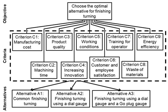An AHP hierarchy valid for the three manufacturing process alternatives can be seen in Figure 5.