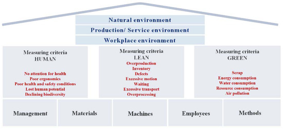 Verrier et al. [14] found that linking the organization’s performance with sustainable development is a platform for adding social (human) and environmental (green) dimensions to lean activities. The study by Azlina et al. [15] established a framework model for Green Lean human resources management practices in the context of quality management. The main goal of the proposed system is to focus on achieving the full development of human resources oriented on their motivation and creativity to be part of a green and lean organization.
