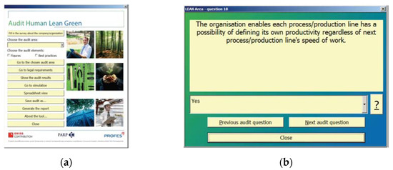 Figure 2. Audit software (HLG Audit tool) example screens: (a) main window, (b) example audit question.