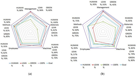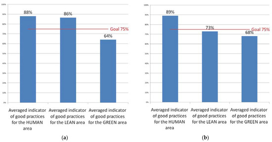 Figure 4. A collective chart of the averaged indicators of good practices in the perspective of the Company X company assessment elements for the Human, Lean and Green areas, (a) 2018, (b) 2021.