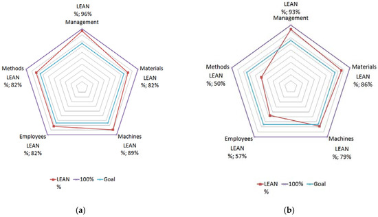 Figure 6. A collective chart of the averaged indicators of good practices in the perspective of the Company X company assessment elements for the LEAN area, (a) 2018, (b) 2021.