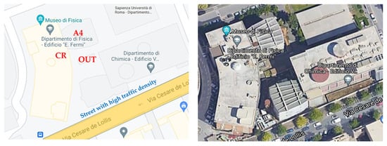 This study is part of the INAIL Project Integrated Evaluation of Indoor Particulate Exposure (VIEPI) and its sampling design has been well described elsewhere [24]. In the framework of Activity 5 (chemical and biological characterization of PM10), one of the three short-term intensive campaigns, November–December 2017, has been assumed for the chemical speciation of PAHs in the PM10 fraction collected in two classrooms, A4 (A4) and the Computer Room (CR), and outdoors at ground floor (OUT) of the Department of Physics of University Sapienza in Rome. A4 and CR are located on the same floor of the building and both look out on a street with high traffic density during weekdays, about 50 m away, from orthogonally-orientated windows (Figure 1). The two classrooms have a similar volume of about 400 m3 but different geometry, A4 of a frontal didactic amphitheater-like shape and CR of a laboratory type with laptop workstations. A4 has two doors and windows that can be opened, as does CR. Moreover, A4 has natural ventilation and presents an access to an external security staircase, whilst CR is equipped with air conditioners, these latter not working during the winter campaign. The two classrooms are also distinguished by frequency of students, because in A4 4 there are lessons from Monday to Friday, while in CR these only occur on a few days a week.