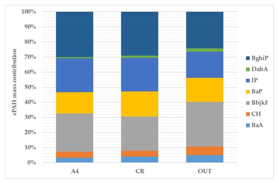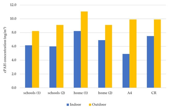 The total cPAH concentrations characterizing the actual mixture were compared to those found in Rome in previous studies. The target PAHs being mainly associated with the finest particles, results can be compared to data obtained from PM10 for similar mixtures in indoor living/working environments. Figure 3 shows that the mean values of cPAH concentrations in A4, CR and OUT are comparable to those measured in Rome, in winter, at schools, homes and outdoors (about 6 to 8 ng/m3 indoors, 8 to 11 ng/m3 outdoors) [29,43,44].