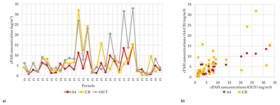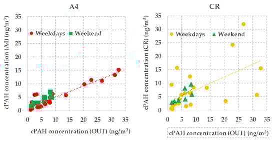 Figure 4 shows cPAH concentrations for the overall winter sampling campaign. Figure 4a shows, in all the environments, that levels for Weekends (P1) are lower than the previously cumulated Wednesday + Thursday + Friday nights (P5). The scatter plot Figure 4b indicates that higher concentrations of CR were similar to those outdoors, while those in A4 were lower. cPAHs over Weekends reached values lower than 10 ng/m3 in both A4 and CR.