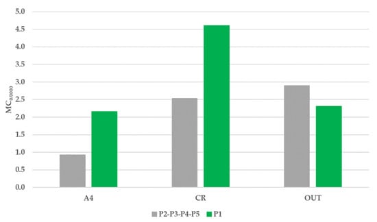 The above trend was investigated in terms of mass contribution of cPAHs to mass of PM10 (MC) for values averaged over the Periods P1 (Weekends) and P2-P3-P4-P5 (Weekdays): . Results are shown in Figure 5.