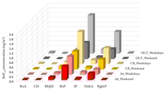 The toxicological profiles averaged over Weekends and Weekdays are reported in Figure 7. Based on these profiles, a major contribution of BaP in determining the carcinogenic potency of the mixtures occurred, either during Weekend or Weekdays, supporting the choice of BaP as a suitable indicator for assessing the contribution of carcinogenic PAHs in ambient air. BaP, being only 16% of the mass of the target mixture, presented the highest toxicological outcome, weighing on average about 57% of the toxicological profile: this value is in accordance with literature data for PM10 in urban areas, which was 54% in in Kuala Lumpur [49] and about 58% in Belgrade Metropolitan [50].