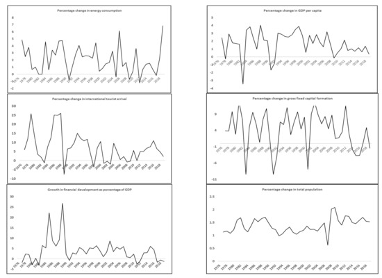 The trend of economic growth in Australia’s economy, as seen in Table 1, shows that per capita GDP was US$27,944.23 and US$29,907.79 in 1976 and 1980, respectively. There was a steady rise in GDP from 1985 to 1995. In 2000, the growth was more than 14% compared with the growth observed in 1995, and GDP reached US$44,334.39 per capita. Each year from 2005 to 2018 also showed an increasing GDP trend in the Australian economy. Figure 1 presents the trend for the log forms of all variables from 1977 to 2018. Logarithms were chosen to obtain a more stable variance [35]. It is clear that the variables displayed no linear trend, and none had an evident seasonality.