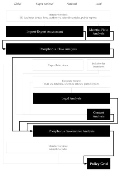 Legal and content analysis contributed the qualitative aspects required to interpret the quantitative depiction of the status quo, thereby outlining the frame of action of local public governance. The legal analysis shed light on the governance framework created by regulatory conditions and the stakeholders involved. The analysis took stock of available capacities and maps relevant key actors. The institutional design of the policy can build on this governance information for the distribution of tasks across suitable authorities and build bridges for collaboration where their fulfillment requires a crossing of departmental remits. The content analysis was adjusted for phosphorus by investigating the social, ecological, and technical flow factors that are presented by Metson et al. (2015) [15].