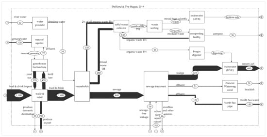 Not all organic or industrial flows that contribute to phosphorus transport could be accounted for. We focused on phosphorus in food-related flows destined for direct human consumption, due to their relevance for urban food security and food system resilience. Other biomass flows (e.g., wood in construction materials, cardboard, or paper) have been omitted from the assessment. More specifically, the food flows for the local SFA and its expansion were calculated by combining the average Dutch diet composition published by van Dooren et al. (2014) [28], with phosphorus concentrations provided by the European Food Safety Authority and the trade statistics of respective food groups and trading countries listed in the official European Market Access Database. Overall, the study was conducted on the basis of 2018 and 2019. It integrated interviews from 2018 with previous and subsequent reports, relevant for flow quantities and policies. The data used in this multi-level research approach has been verified whenever possible by cross-checking the information with various sources.