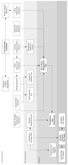 The governance of phosphorus flows in Delfland and The Hague is embedded in a multi-level legal framework ranging from local to European (see Figure 3). Currently, most European, or Dutch phosphorus regulation that affects the local situation aims to protect water bodies from eutrophication. It does not deal with concerns of scarcity, food security or environmental justice. The legislation in question is the EU Water Framework Directive (WFD), the Nitrate Directive (ND), the National Emission Ceiling Directive (NECD), the Groundwater Directive (GD), the Marine Strategy Framework Directive (MSFD), the Industrial Emissions Directive (IED), the Urban Wastewater Directive (UWWD), and the Sewage Sludge Directive (SSD) [30,31,32]. At the Dutch federal level, instigated in part by the EU regulation, it comprises the Dutch Phosphorus Reduction Decree, the Manure and Fertilizer Act and the Soil Protection Act. Soon, the revised Circular Economy Action Plan will be an integral part of the regulatory context in the EU.