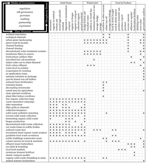 The policy grid for strategic local phosphorus planning: Flows (of Figure 2) can be subjected to adjustment measures under the six modes of governance available to local policymakers.