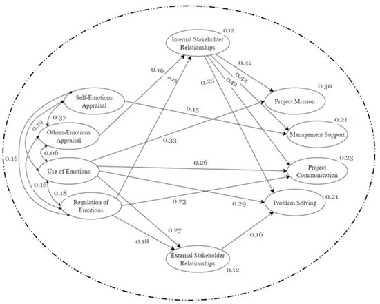 As can be seen from Table 7, in the SEM final model of elements of emotional intelligence, self-emotions appraisals were related solely to top management support, from all the elements of project success. The use of emotions was related to the project mission, project communication, and problem-solving, while regulation of emotions was related solely to project communication. These findings mainly support hypothesis H1.