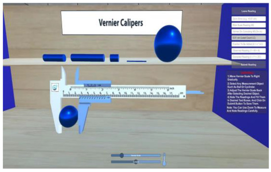 The application having a 3D environment as shown in Figure 1 was meant for physics experiments for secondary school students. It included four experiments: Vernier Calipers (as shown in Figure 2), Coefficient of Sliding Friction, Acceleration of a Rolling Ball on an Angle Iron, and the Value of G by Free Fall Method. The application was designed in Unity 3D and Blender and developed using .NET Framework, C#, PHP, and MySql technologies.