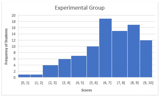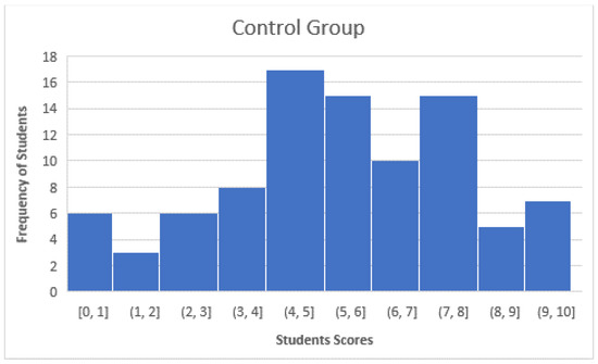 The data would be considered normally distributed if the skewness values were between −0.5 and 0.5. The skewness results showed that the CG was normally distributed with the value of −0.33, whereas the EG had a slightly greater value (−0.77) than ±0.5. The skewness can be seen for each group through the histograms presented in Figure 3 and Figure 4.