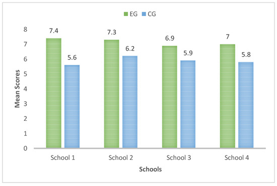 The mean scores were also calculated for both groups as shown in Figure 5. The experimental groups scored significantly better or higher than the CG participants. This means that the students’ performances were improved through the virtual laboratory application. This study also evaluated the performance of the EGs within the schools. It was observed that the EG participants of School 1 performed better than the other three schools with an average mean score of 7.4, which was the highest among the groups.
