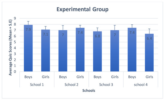 The effectiveness of the virtual laboratory was also evaluated on the basis of gender through the quiz scores. The user study consisted of 99 boys and 85 girls who were randomly allocated to both groups. The mean scores of the EG participants are shown in Figure 6 with the standard error mean. The mean values were almost the same for the boys and girls in all four schools. The z-test was applied on the quiz scores to find differences among the boys and girls.