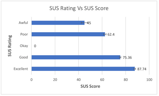 According to the SUS results shown in Table 8, the scores were listed as above and below average. The maximum number of scores, with a frequency of F = 31, was recorded in the ‘Excellent’ rating, which means most of the scores were above 80.3 with a mean score M = 87.74 and a standard deviation SD = 4.11. The ‘Good’ rating contained scores between the range of 68–80.3 with a total F = 28. This was the second-highest count for the SUS results, with M = 75.36 and SD = 3.18. This rating was also above average, which counted as acceptable. Interestingly, none of the scores were equal to 68 under the ‘Okay’ rating. A below average score count of F = 26 is listed in the ‘Poor’ rating. The calculated scores were between a range of 51–67, which was also a marginally acceptable range, with M = 62.4 and SD = 5.21. The ‘Awful’ rating consisted of 7 counts, and the scores were below 51. This could be because of a misunderstanding of the SUS questionnaire or participants not paying attention when filling out the questionnaire. Therefore, this rating was not listed in the acceptable category. The SUS rating vs. mean scores with the use of the standard error mean is graphically represented in Figure 8.