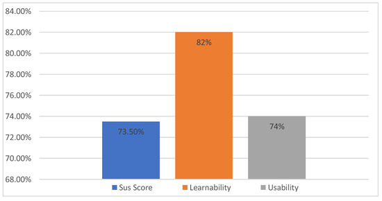 There were two factors (i.e., learnability and usability) assessed by the SUS questionnaire. The learnability included two items—item four and item nine—while the remaining eight items belonged to usability. In terms of the results, the average score for learnability was 82%, whereas it was 73.6% for usability. Figure 9 shows the learnability and usability scores compared to the overall SUS score.