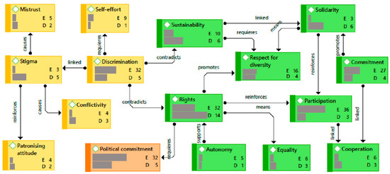 Figure 1. Identifying elements in inclusive education in Bolivia. Positive elements appear in green; negative elements in yellow; variable elements in orange. The letters E and D inside the codes indicate the following information: Rooting (E) or number of citations that have been linked to that code which indicates the saturation of the discourse; and Density (D) or number of links to other citations. Source: authors. Network created with the data analysis software Atlas.ti V.8.