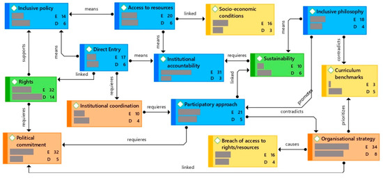 Figure 2. Identifying elements in Bolivian education policies in the area of educational inclusion. Essential elements appear in green; positive elements in blue; negative elements in yellow; variable elements in orange. The letters E and D inside the codes indicate the following information: Rooting (E) or number of citations that have been linked to that code which indicates the saturation of the discourse; and Density (D) or number of links to other citations. Source: authors. Network created with the data analysis software Atlas.ti V.8.