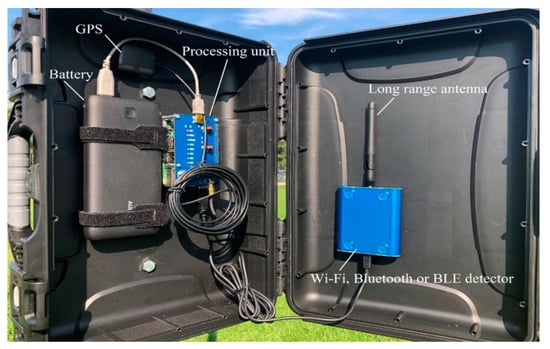 This research was conducted using signal scanners, typically used for traffic data collection which function in three scanning modes. They could scan the three signal modes in their surrounding area using three separate signal detectors. There was also a software platform for monitoring and analyzing the collected data including MAC address, signal mode, detection timestamp, and RSSI. The three scanning modes were Wi-Fi (IEEE 802.11 b/g/n, Receiver Sensitivity: −92 dBm, Transmit Power: +18 dBm), Bluetooth (Class 1, Receiver Sensitivity: −90 dBm, Transmit Power: +18 dBm), and BLE (Receiver Sensitivity: −96 dBm, Transmit Power: +4 dBm) as shown in Figure 1. The antennas used with the signal scanners were long-range, omnidirectional, 2400 MHz and 2 dBi gain. The beacon in Wi-Fi and Bluetooth modes was an Android operated cell phone and the BLE beacon was a BLE 4.0/4.1 signal transmitter.