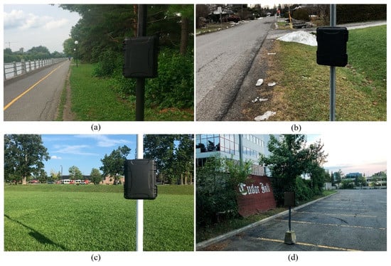 Five experiments were designed for evaluating the five aforementioned factors. They were conducted outdoors in four sites located in Ottawa, Canada (Figure 2): (a) Rideau Canal bike road, a path used by bikes and pedestrians located several meters away from Colonel By Drive near Carleton University campus, both with moderate traffic flows (Site 1), (b) a residential street with a low traffic flow (Site 2), (c) Hunt Club-Riverside Park soccer field next to Paul Anka Drive with a moderate traffic flow (Site 3), (d) a public parking area next to a high-rise building in which there were a few vehicles on the experiment day (Site 4). As mentioned, the locations were not isolated; there were other beacons in the areas and some activities taking place in the vicinity. The location, weather and environmental conditions were approximately similar for each experiment. Based on the results of the five experiments, the most appropriate wireless signal mode for integration in collision warning systems will be recommended.
