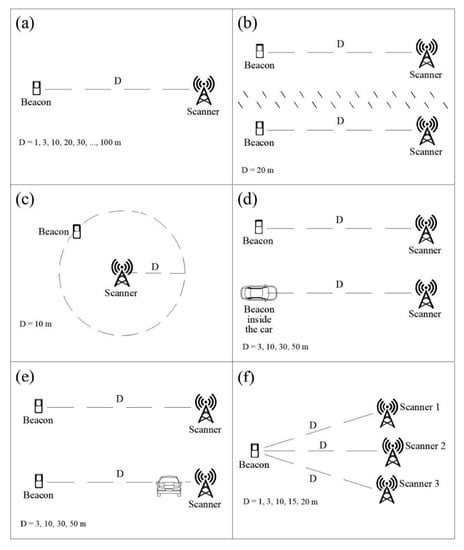 Signal scanners and beacon arrangement in (a) Experiment 1; (b) Experiment 2; (c) Experiment 3; (d) Experiment 4-1; (e) Experiment 4-2; (f) Experiment 5.