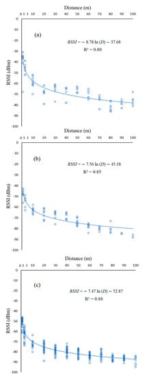 Received signal strength indicator (RSSI)—distance curves for (a) Wi-Fi mode; (b) Bluetooth mode; (c) Bluetooth Low Energy (BLE) mode.