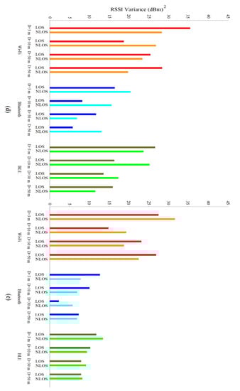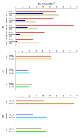 The results of the experiments conducted to investigate the impacts of rainfall on the signals may be observed in Table 2 and Figure 5b. The table compares the number of detections, average RSSI values and their variances before and during the rainfall in each mode. Figure 5b involves the histogram of the RSSI variances. As observed, none of the parameters were considerably affected by rainfall during a continuous data collection in the three modes. Hence, rainfall does not appear to impact the positioning results given that data are collected without changing other factors.